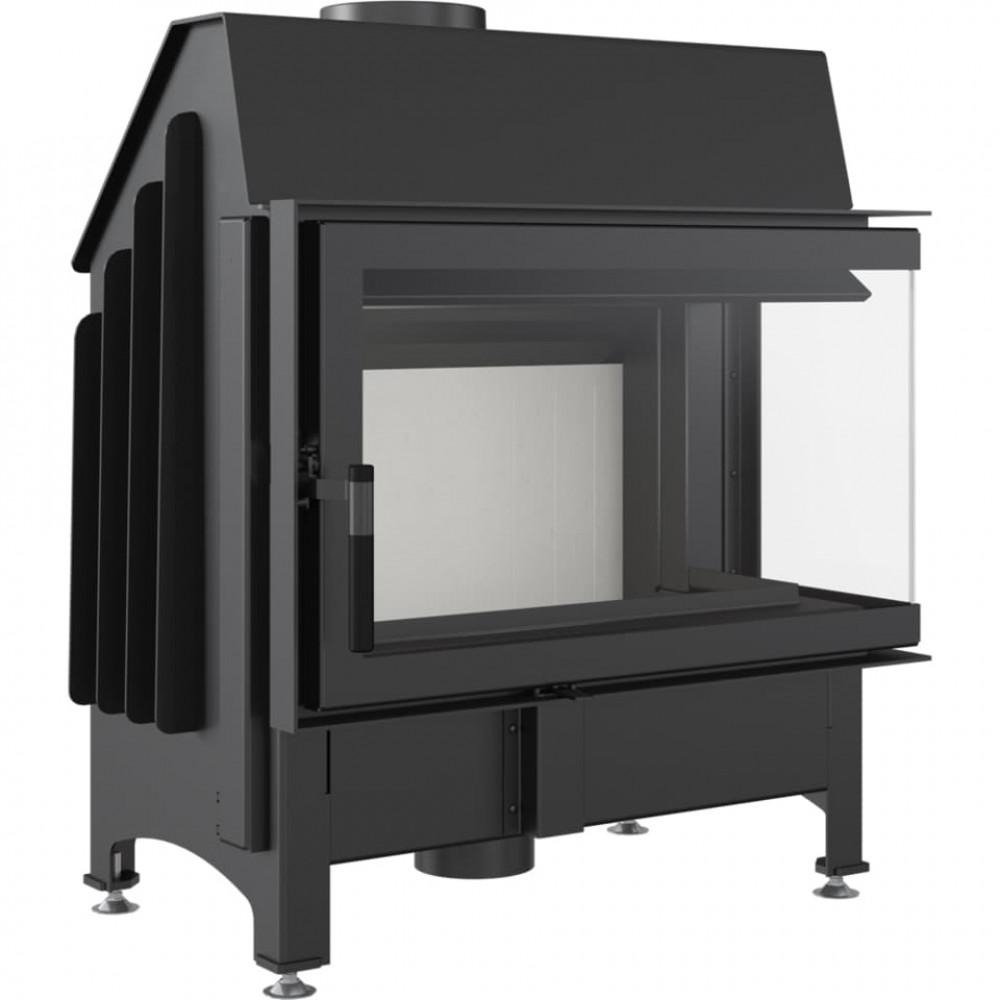 Каминная топка с двумя стеклянными панелями, сопоставленными друг напротив друга под прямым углом (стеклянные панели соединены без рамы).