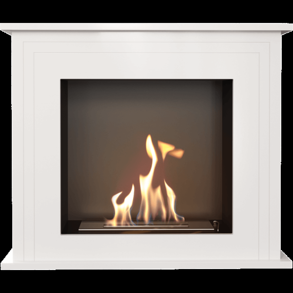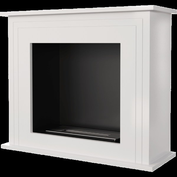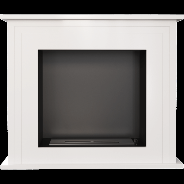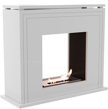 Напольный биокамин с порталом в английском стиле. Портал биокамина выполнен из МДФ и окрашен в белый цвет. Внутренний корпус из нержавеющей стали с порошковым покрытием черного цвета. Регулировка интенсивности пламени выполняется крышкой горелки. Представленная модель предназначена для использования в жилых помещениях. Монтируется вплотную к плоской стене.